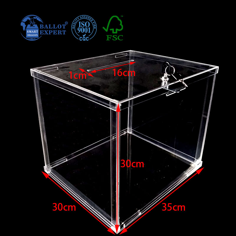 Acrylic boxes are widely used and are typically used as ballot boxes, charity box, suggestion box, donation box and money box. As the factory with the largest number of ballot box molds, we provide customers with acrylic boxes of various sizes and capacities, and provide customized services with logos or stickers. Whether it's presidential elections, church voting, or charitable donations, Smart Dragon International Election Service company can realize your needs at a very competitive price and guarantee on-time production and delivery.
